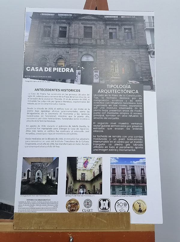 Al respecto, la secretaria general de la SGHEL, Irma Carolina Romero, dio lectura a un escrito enviado por el autor Carlos Cahuantzi Lima: “Las construcciones históricas de Tlaxcala son testimonio vivo del pasado, este informe analiza nueve edificaciones clave, desde el Portal Hidalgo hasta el Puente Rojo para demostrar como su arquitectura es una huella material de nacional proceso político y social que forjó la identidad tlaxcalteca”.